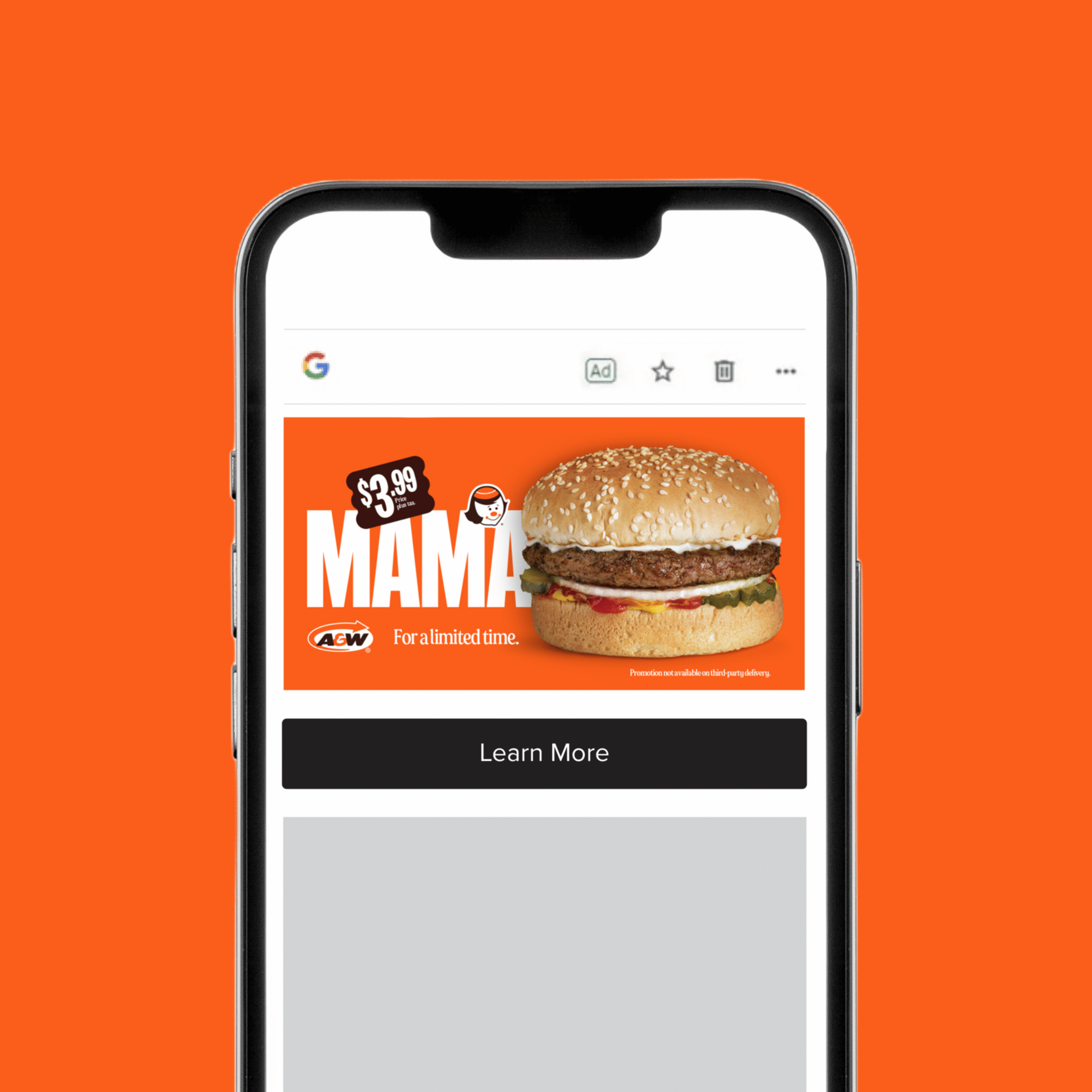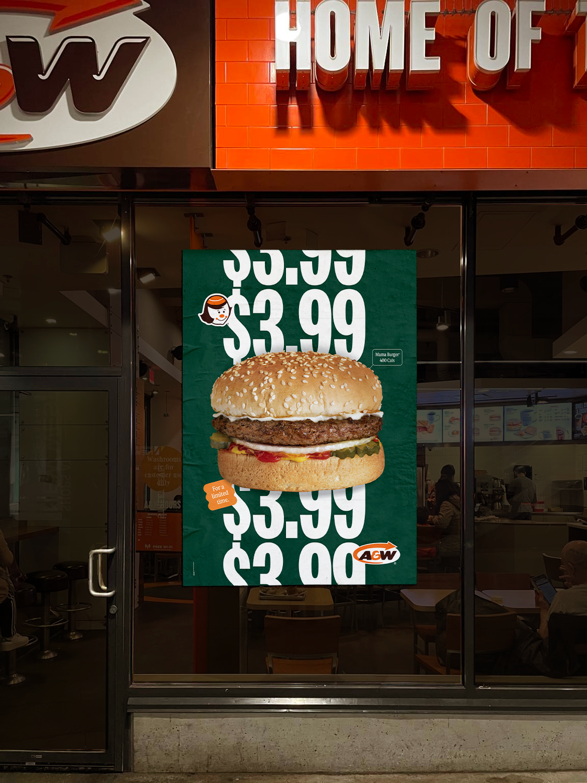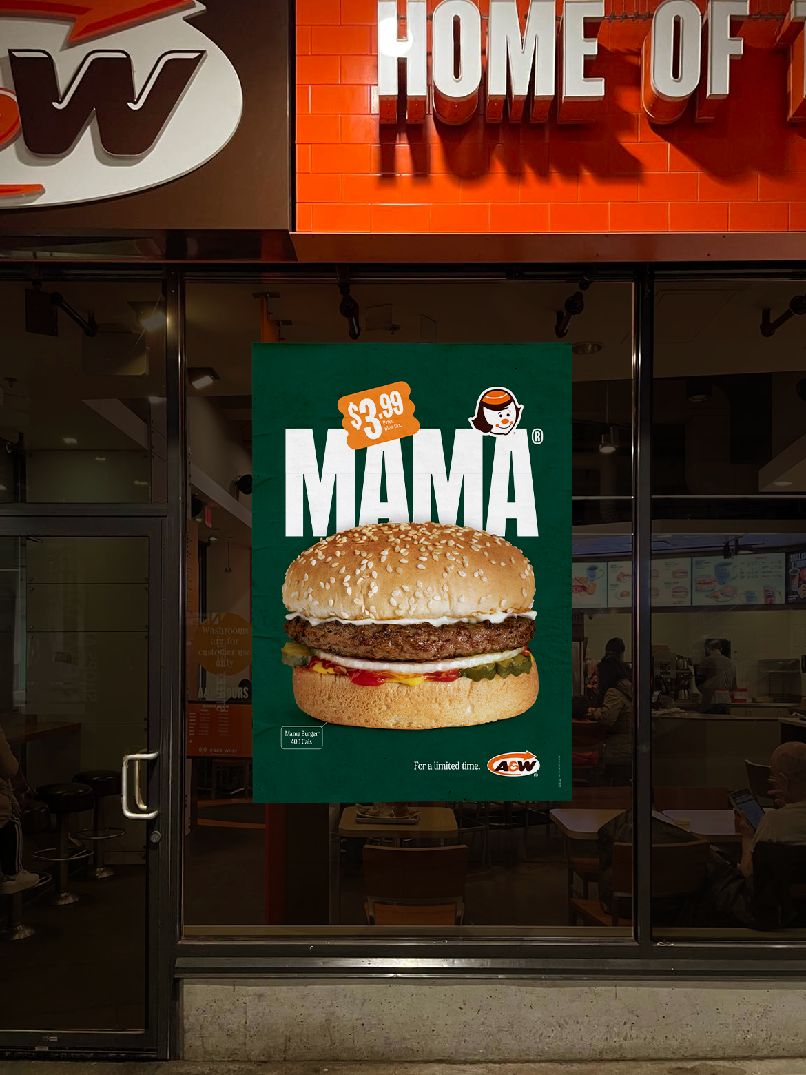 A&W featured the Mama Burger as a limited time offer. The purpose of the campaign was to drive customers to their restaurant using a price point driven headline.